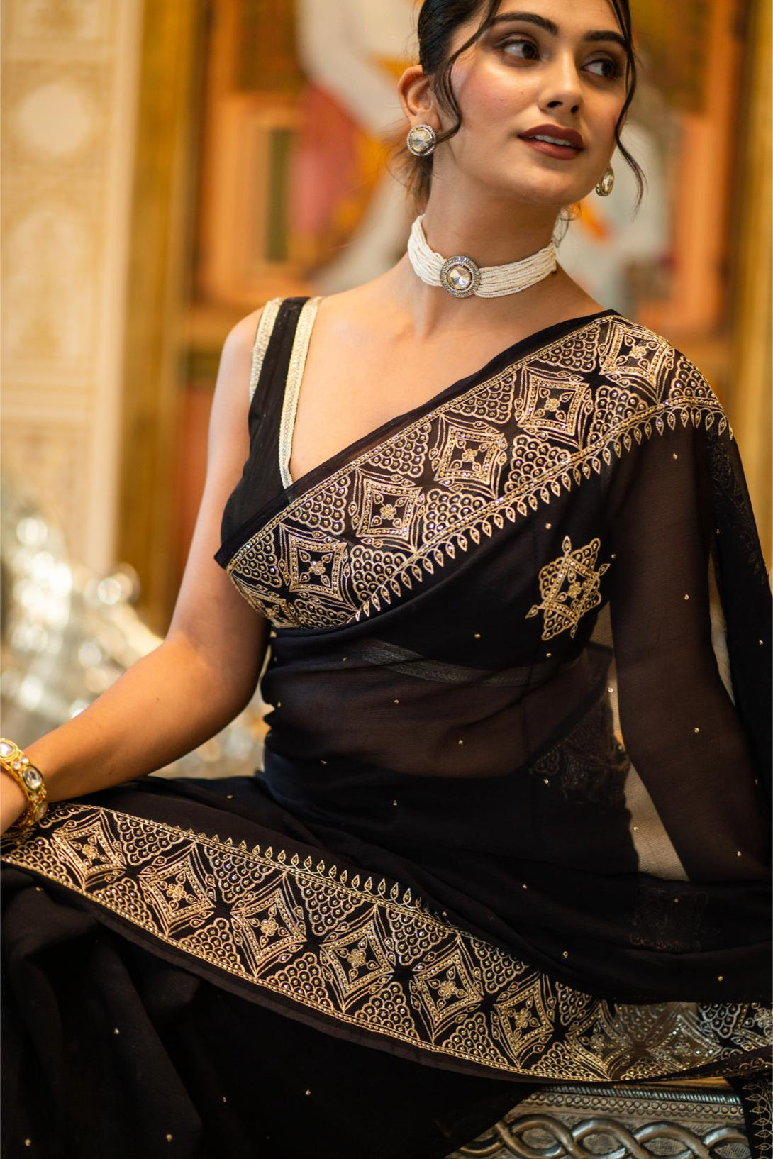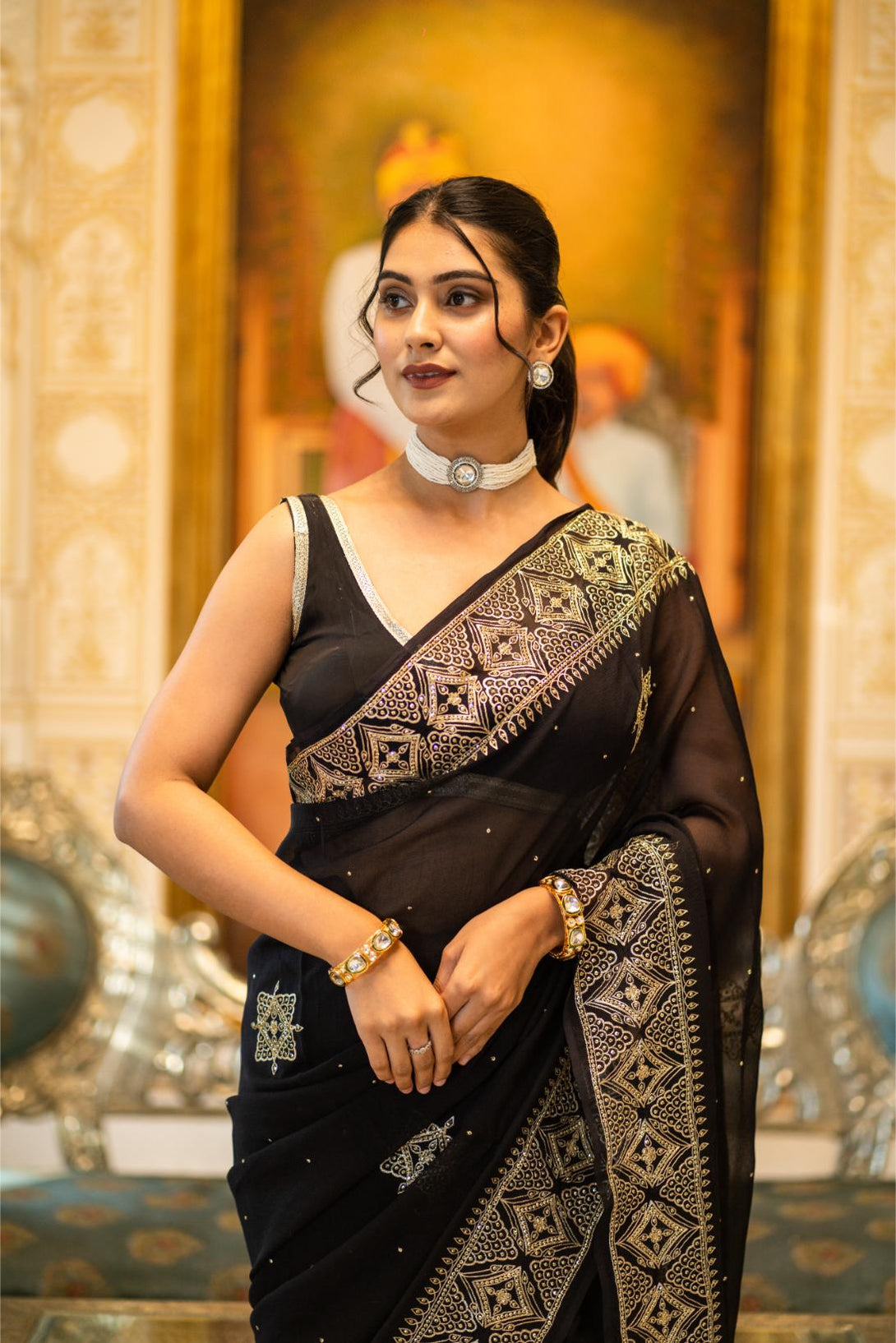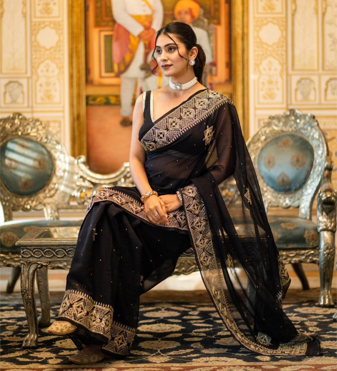 Timeless and elegant, this Black Pure Chiffon Saree exudes sheer sophistication. The lightweight fabric drapes beautifully, offering a graceful silhouette perfect for evening events and special occasions. A must-have for every wardrobe, this saree is the epitome of effortless charm.