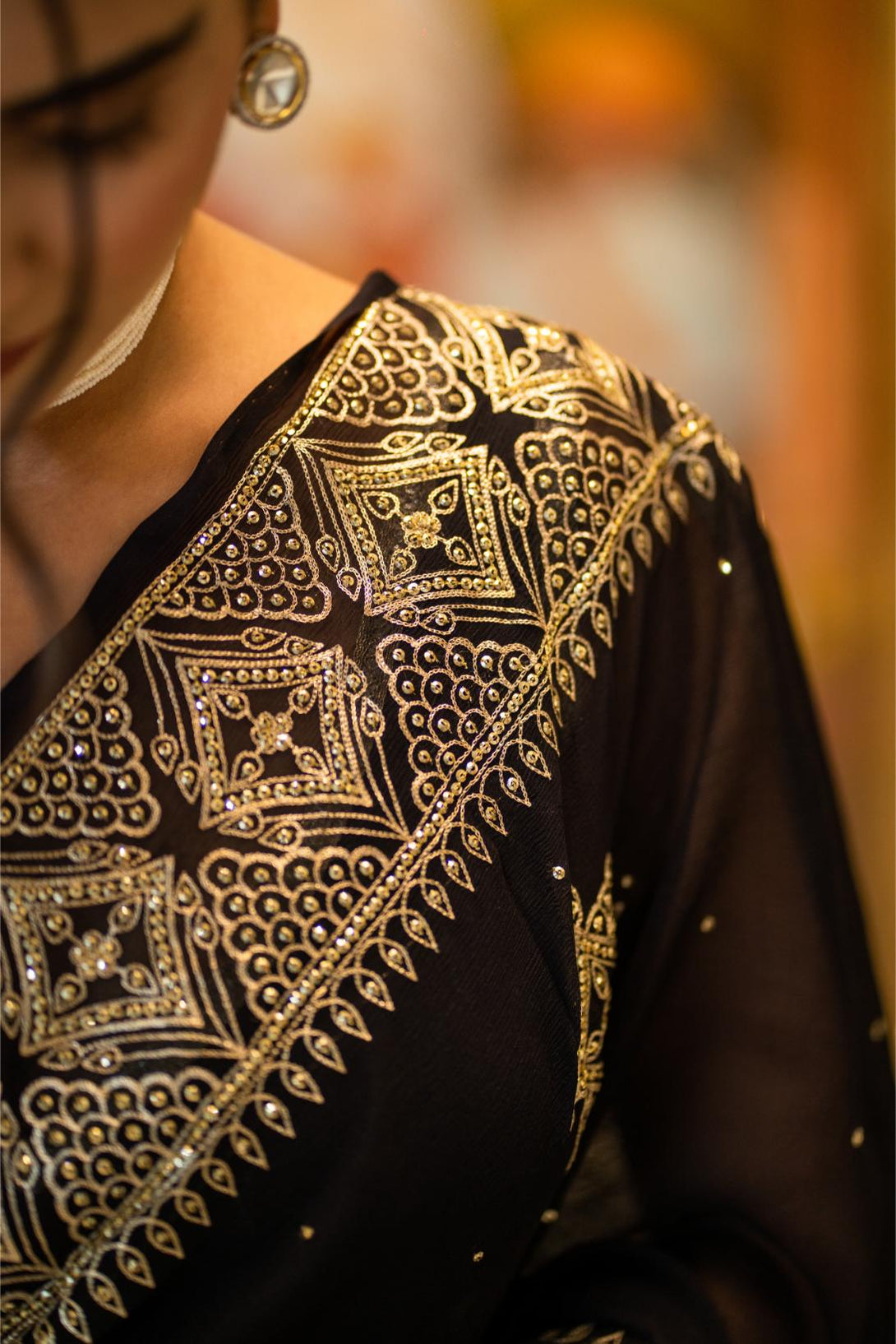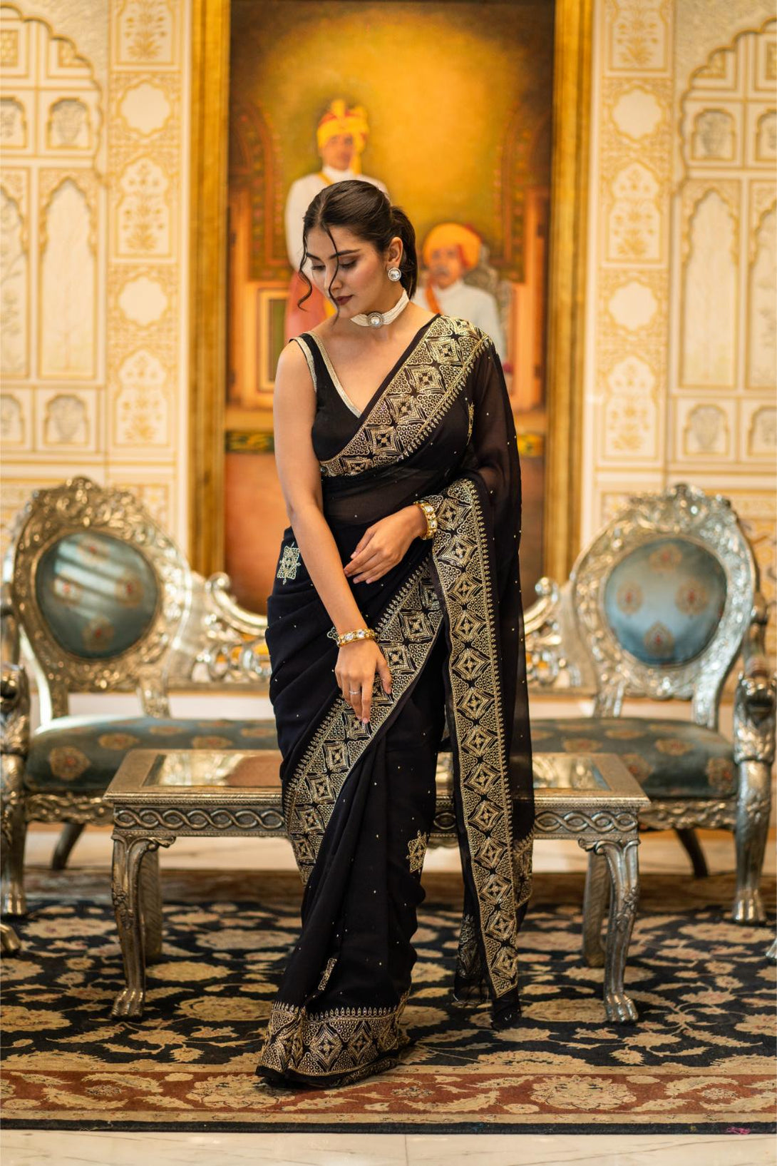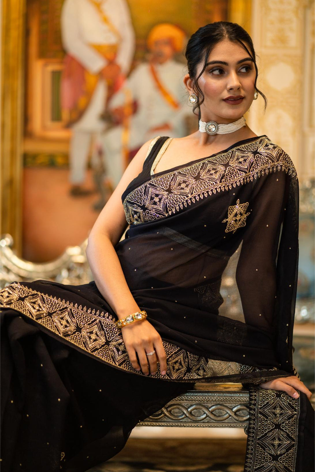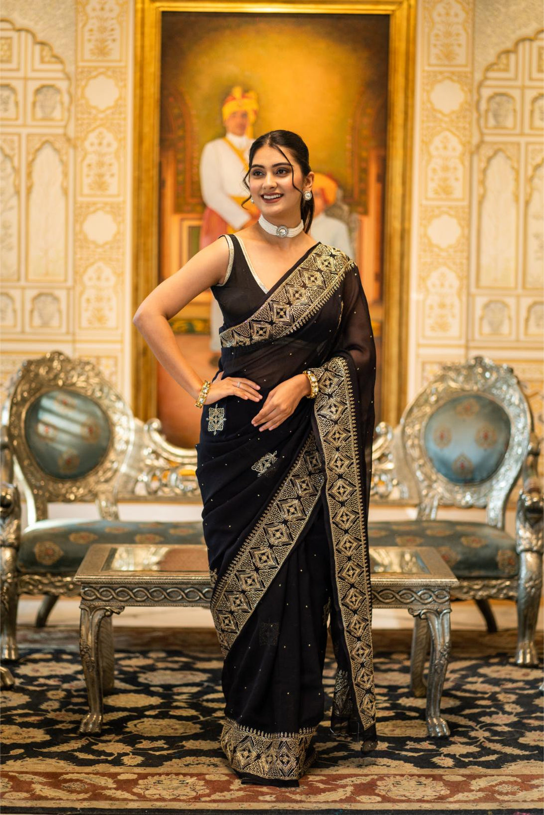 Timeless and elegant, this Black Pure Chiffon Saree exudes sheer sophistication. The lightweight fabric drapes beautifully, offering a graceful silhouette perfect for evening events and special occasions. A must-have for every wardrobe, this saree is the epitome of effortless charm.
