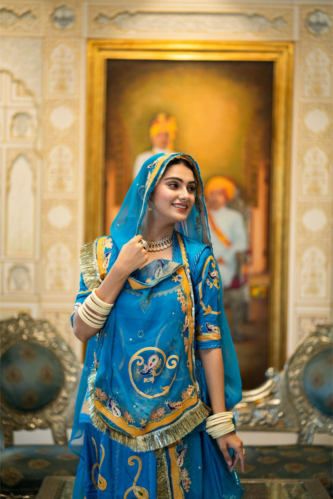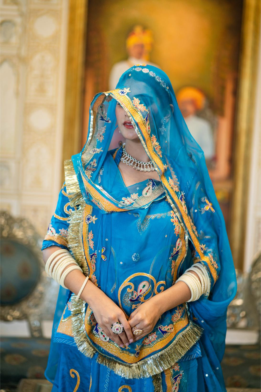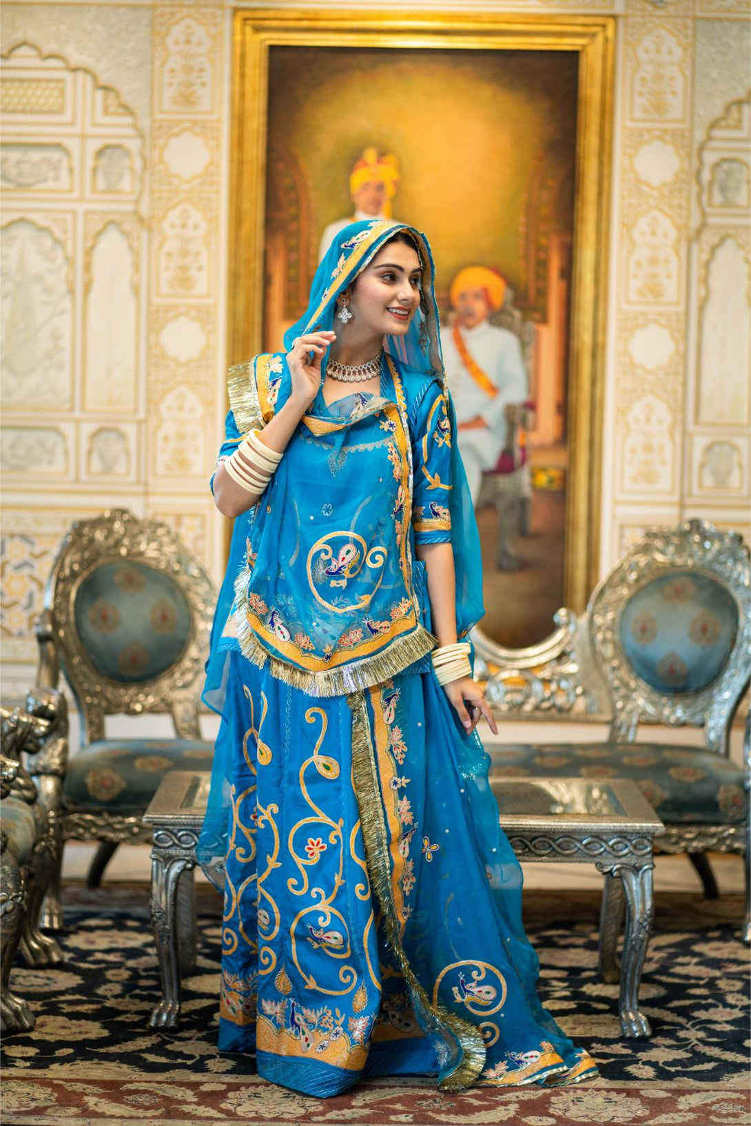 This Blue Satin Poshak, featuring intricate peacock embroidery, brings together luxury and tradition in perfect harmony. The rich satin fabric enhances the vibrant blue hue, while the detailed peacock design adds a regal and artistic touch. Ideal for weddings and festive events, this poshak ensures you make a striking impression with its elegance and grace.