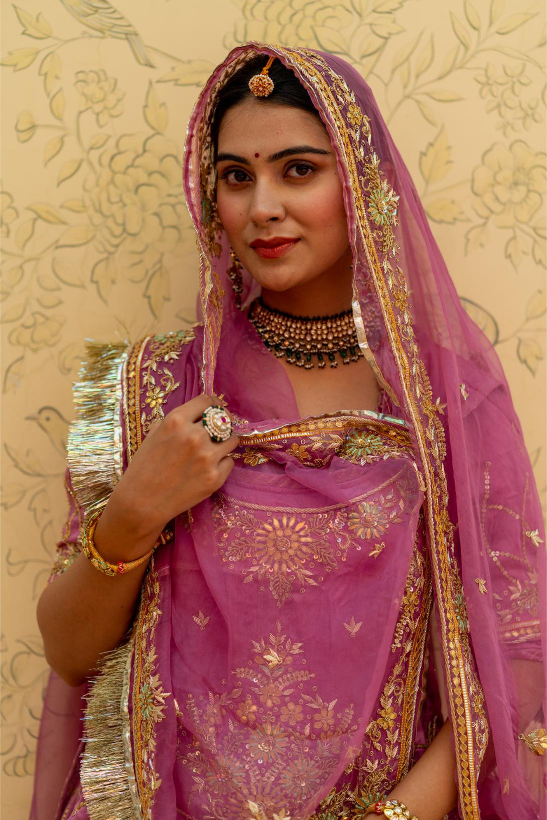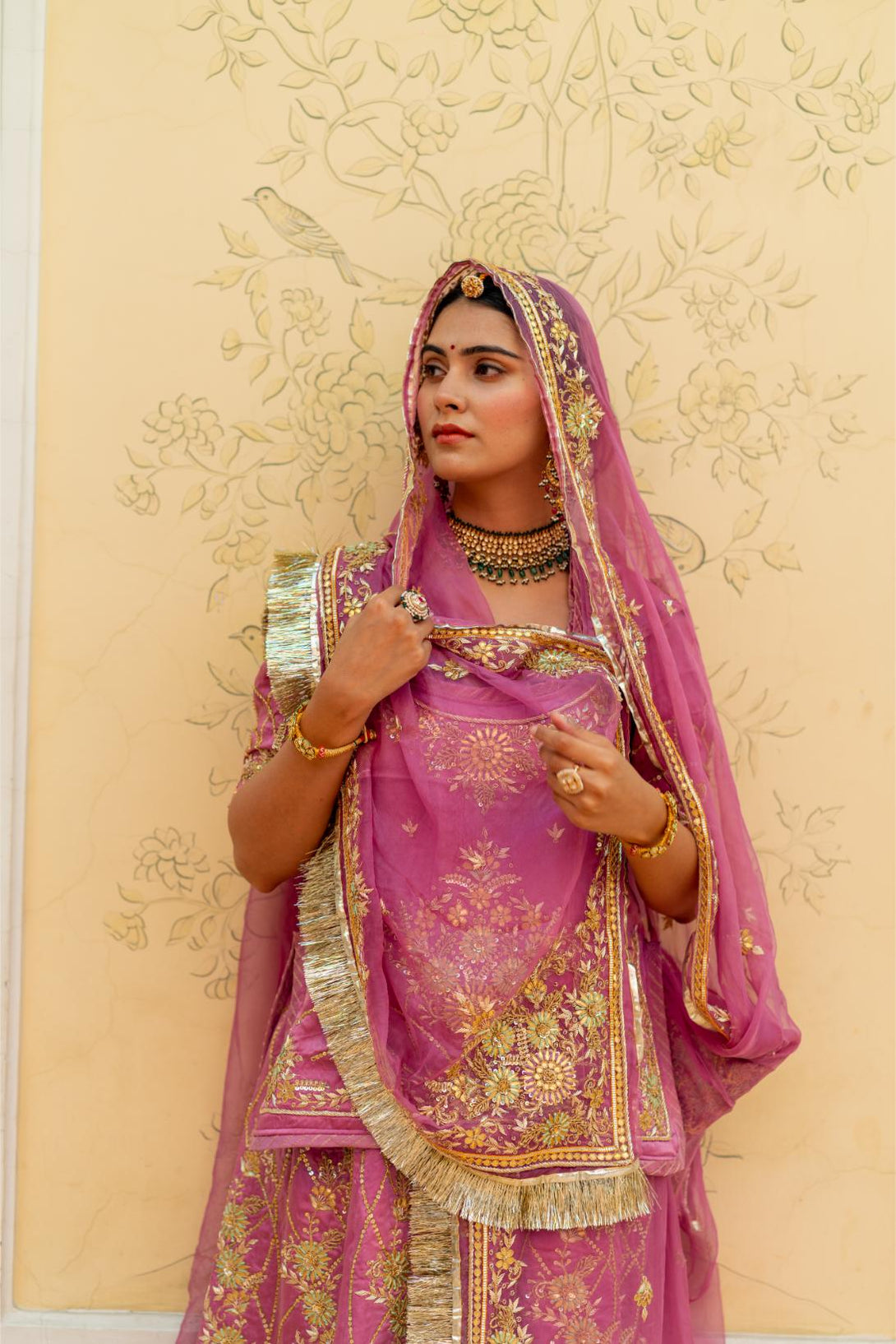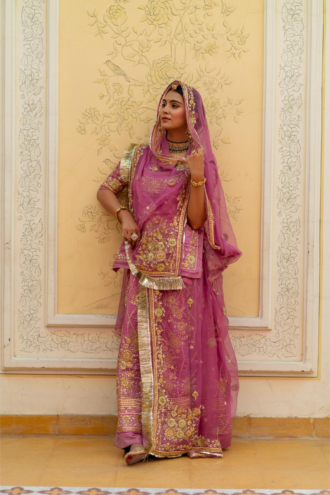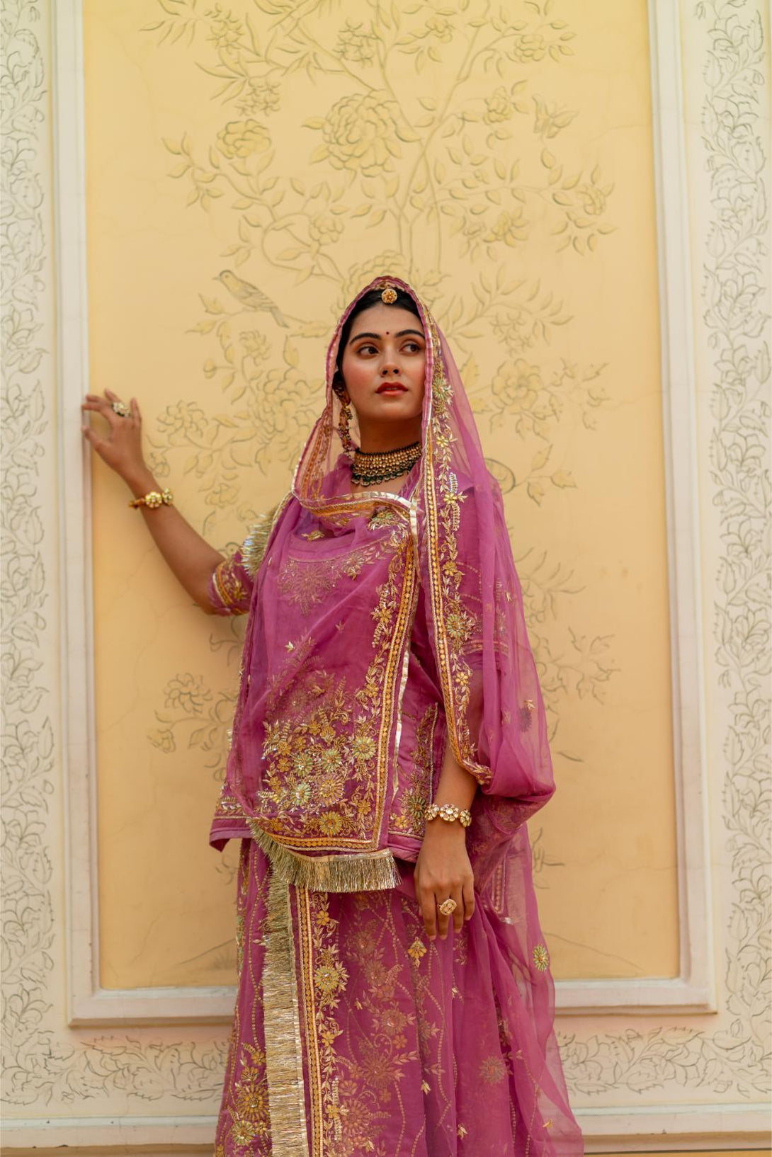 This Heavy Bridal Satin Poshak is a true masterpiece, featuring intricate Zari, Resham, and Gota Patti work. The rich satin fabric gives it a luxurious feel, while the detailed embroidery brings an opulent touch. Perfect for your wedding day or grand celebrations, this poshak combines tradition and elegance in every stitch.