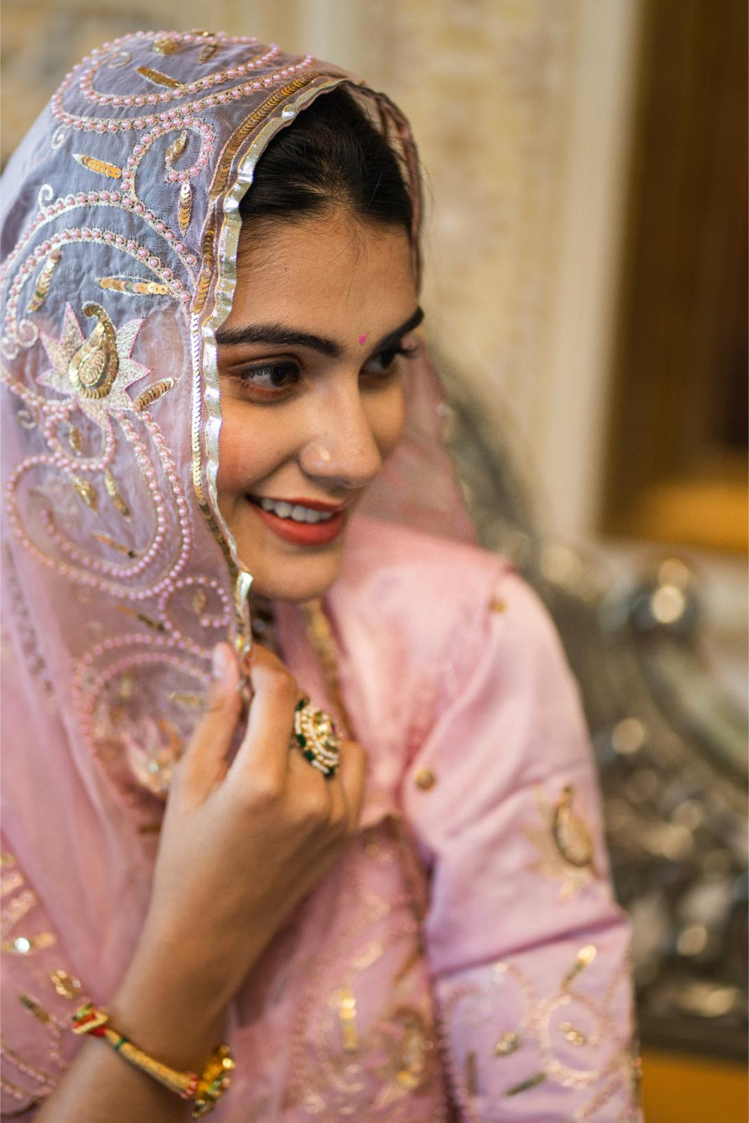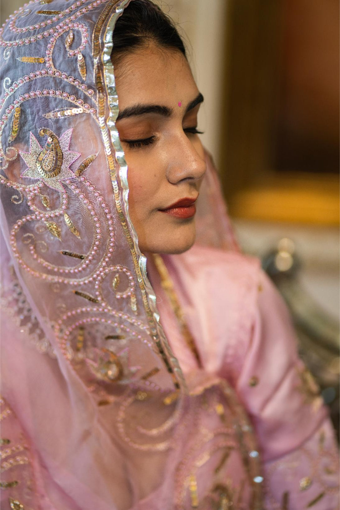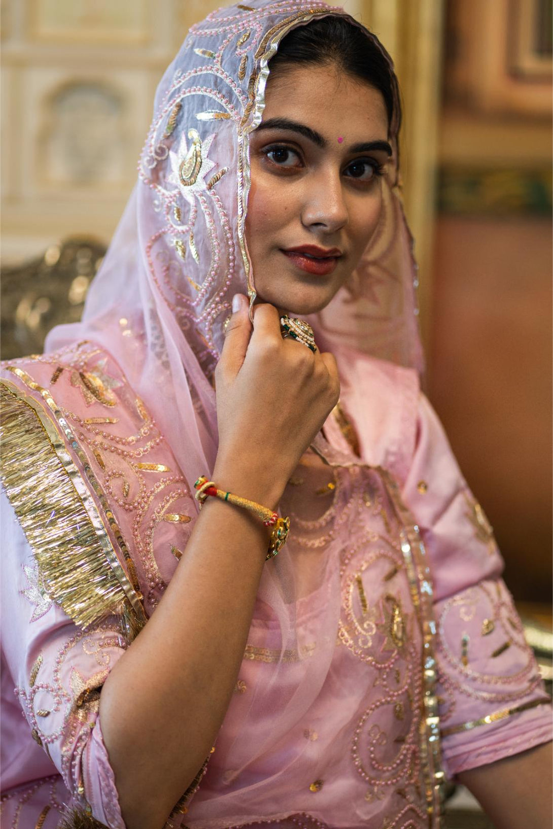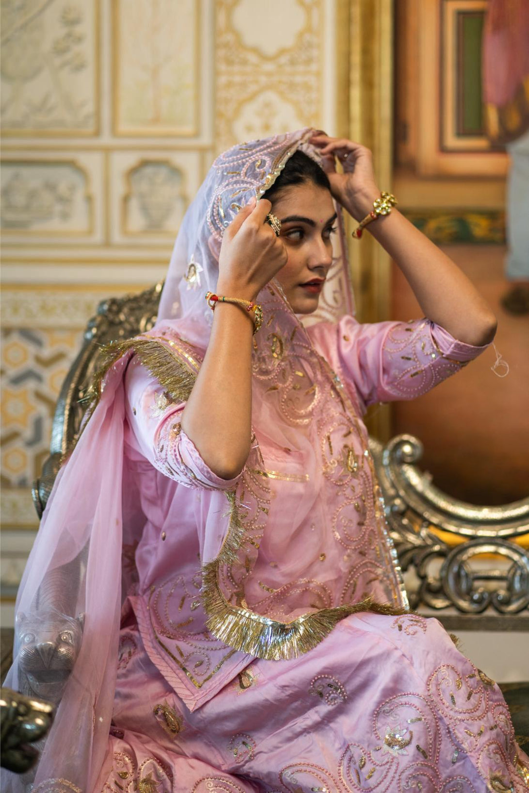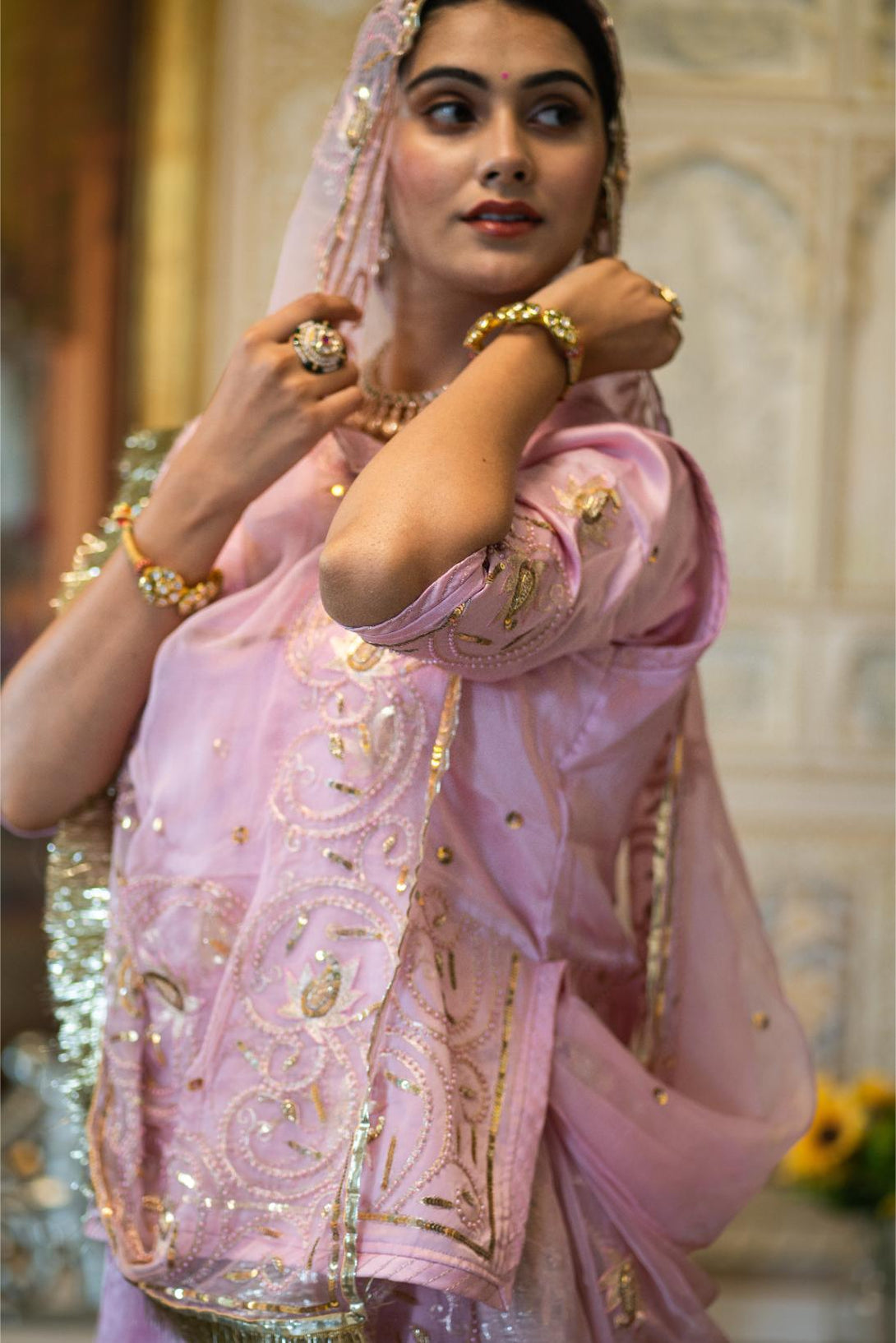 Graceful and refined, this Pink Pearl & Work Poshak features delicate pearl embellishments paired with intricate traditional work. The soft pink fabric exudes elegance, while the detailed embroidery brings a sophisticated, festive charm. Perfect for weddings and special occasions, this poshak combines timeless beauty with modern refinement.