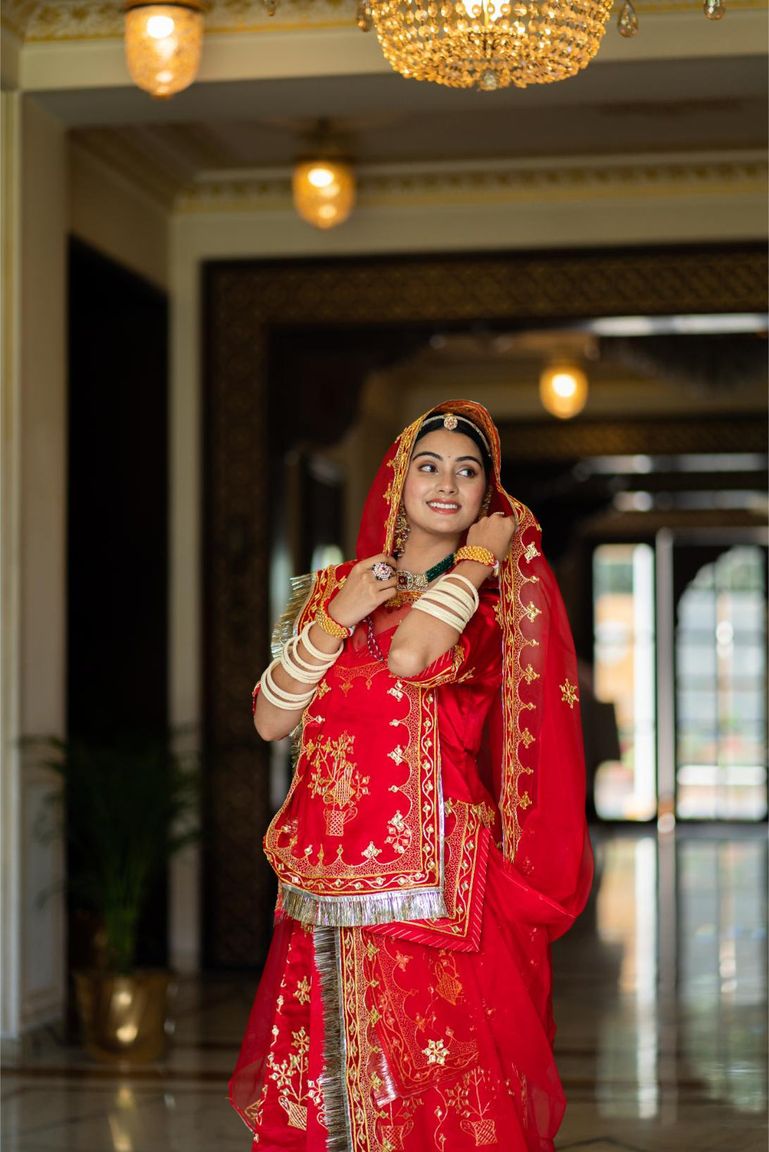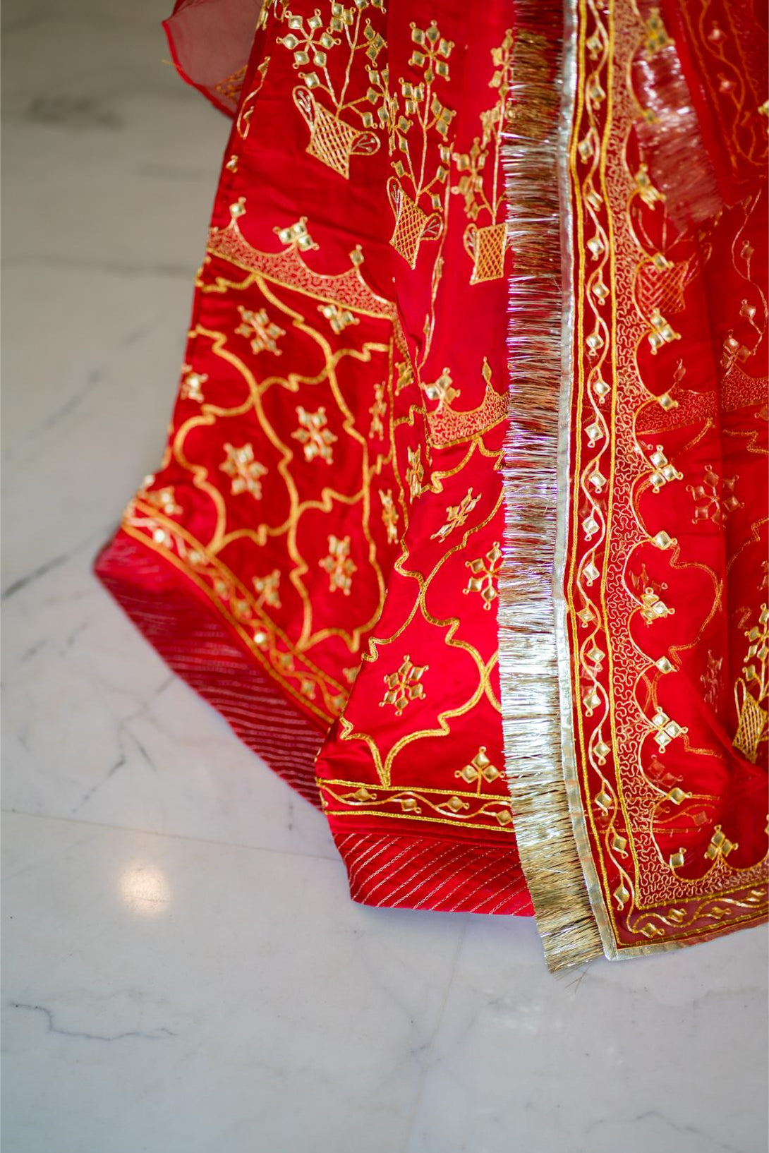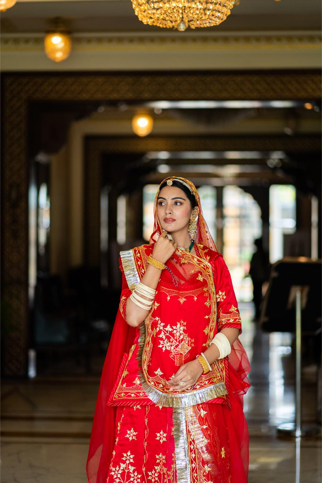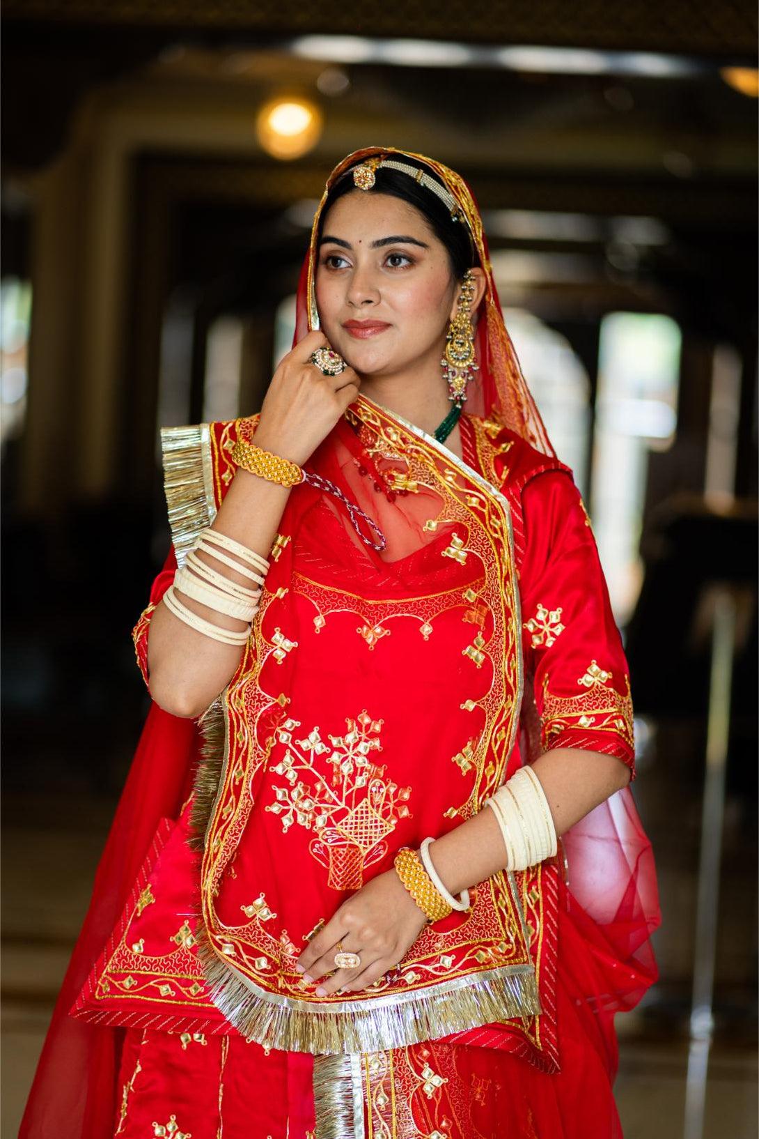 This Red Bridal Danka Work Poshak is the epitome of grandeur and tradition. Adorned with intricate Danka work, the vibrant red fabric shines with a regal touch, making it perfect for brides who want to stand out on their special day. The rich embroidery enhances the poshak's opulence, ensuring a breathtaking look for weddings and ceremonial occasions.