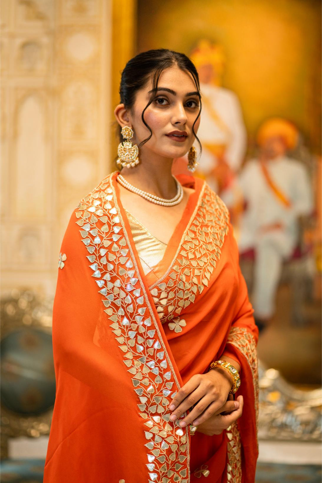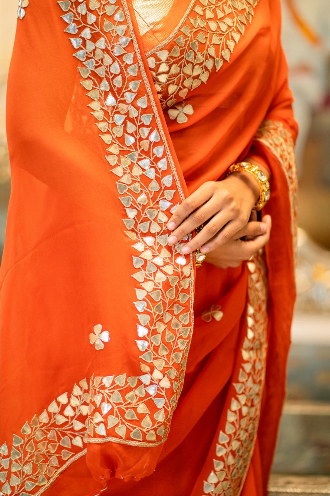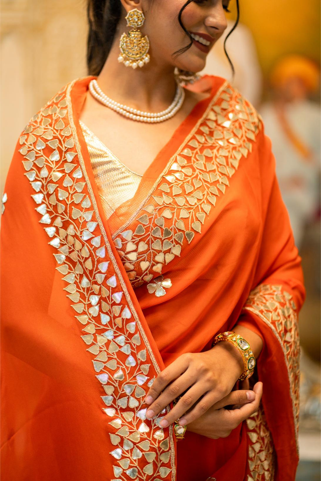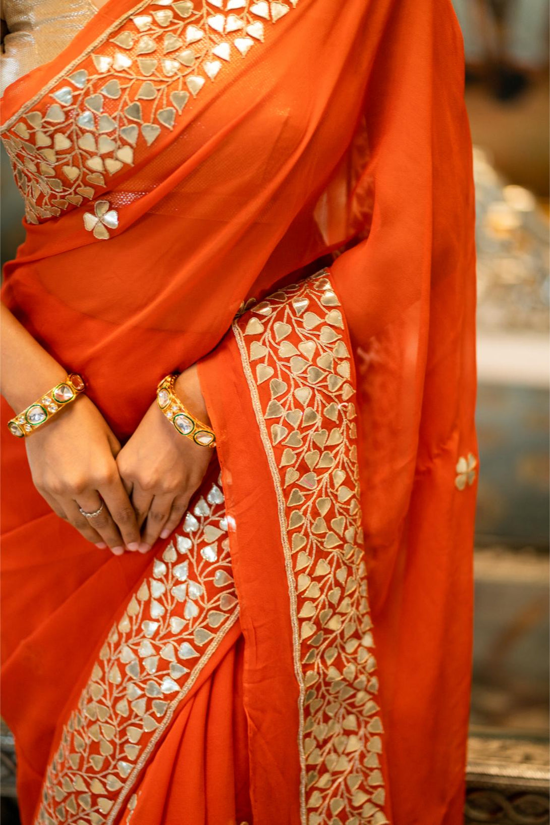 Rust Orange Pure Gorgette Saree With Gota Patti Work
