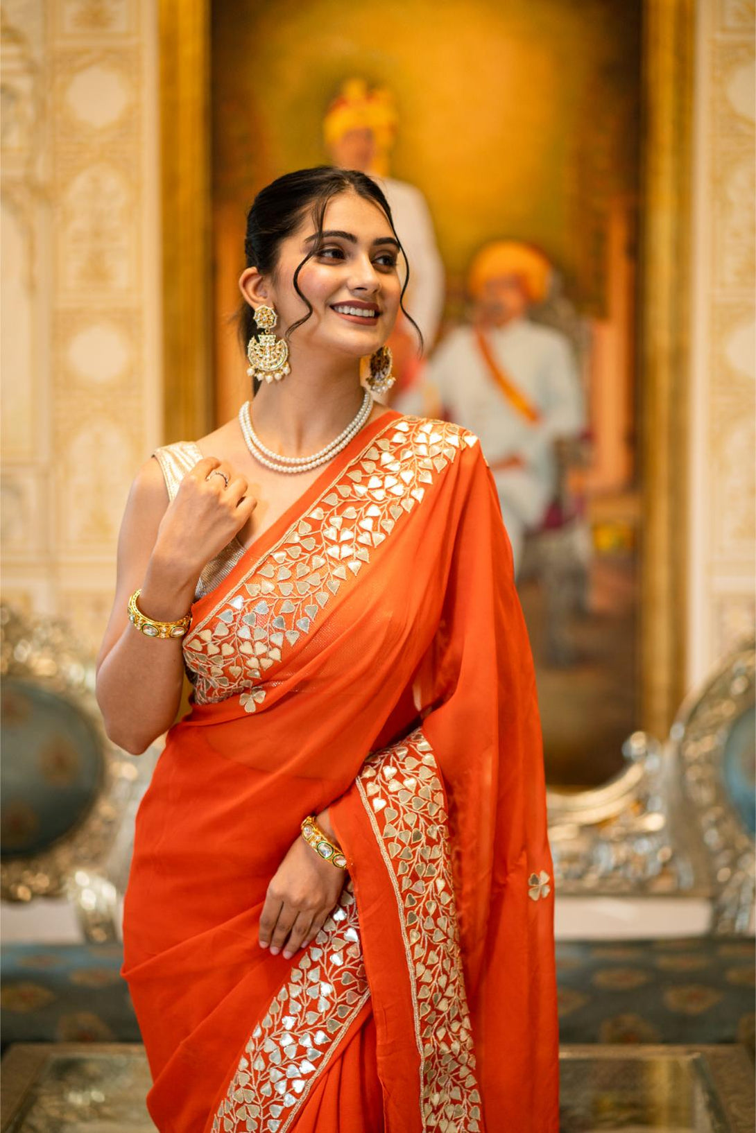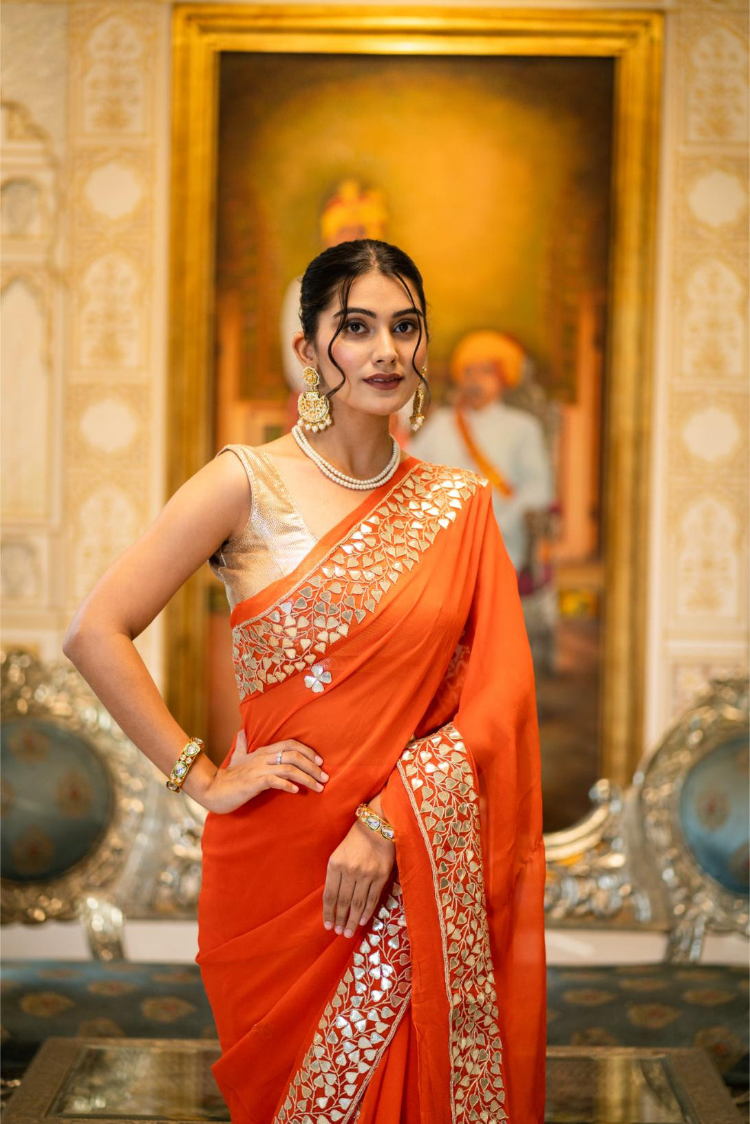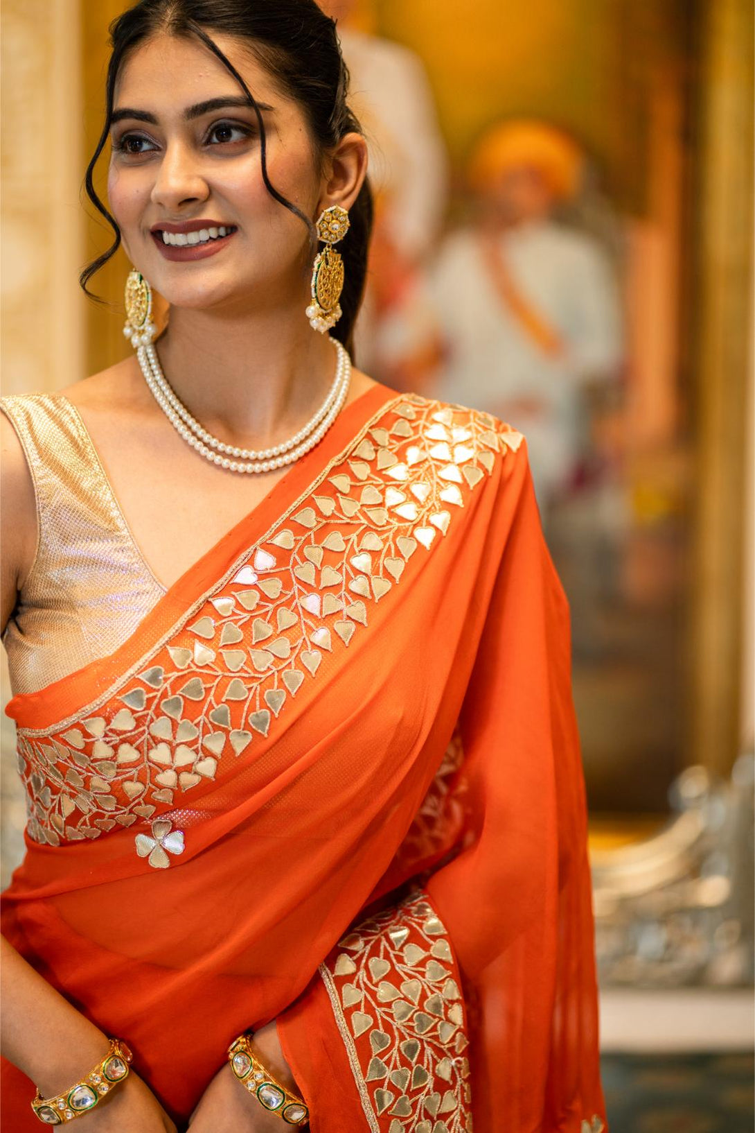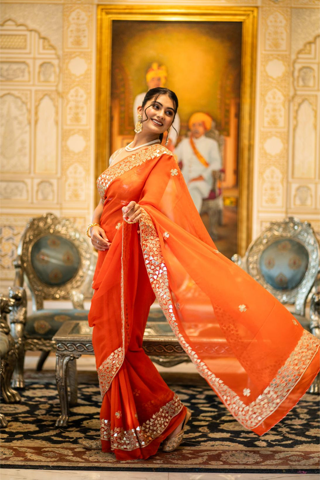 Rust Orange Pure Gorgette Saree With Gota Patti Work