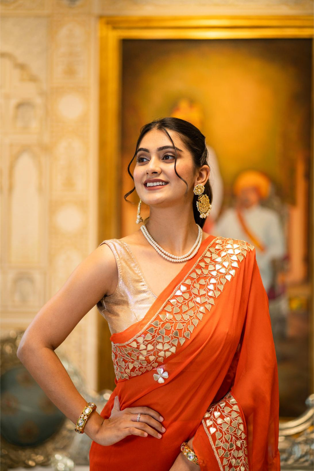 Embrace tradition with this Rust Orange Pure Georgette Saree, adorned with exquisite Gota Patti work. The rich, earthy hue complements the intricate craftsmanship, making it a perfect choice for festive occasions and celebrations. Lightweight yet luxurious, this saree ensures effortless elegance with every drape.