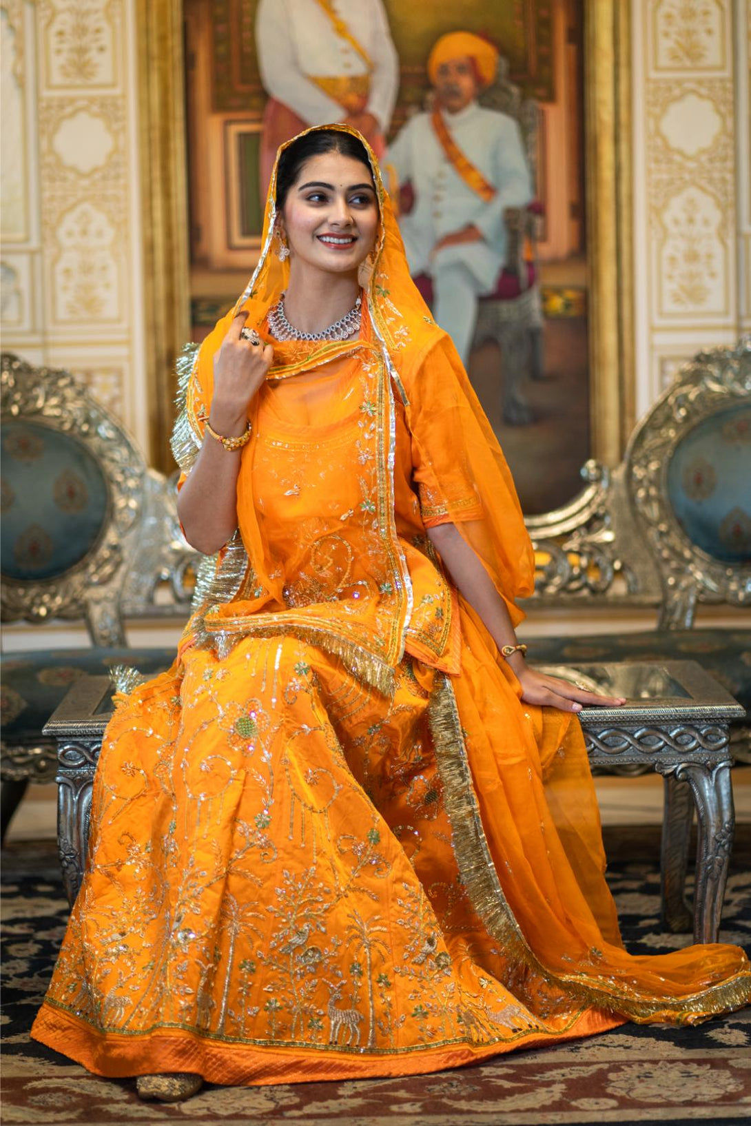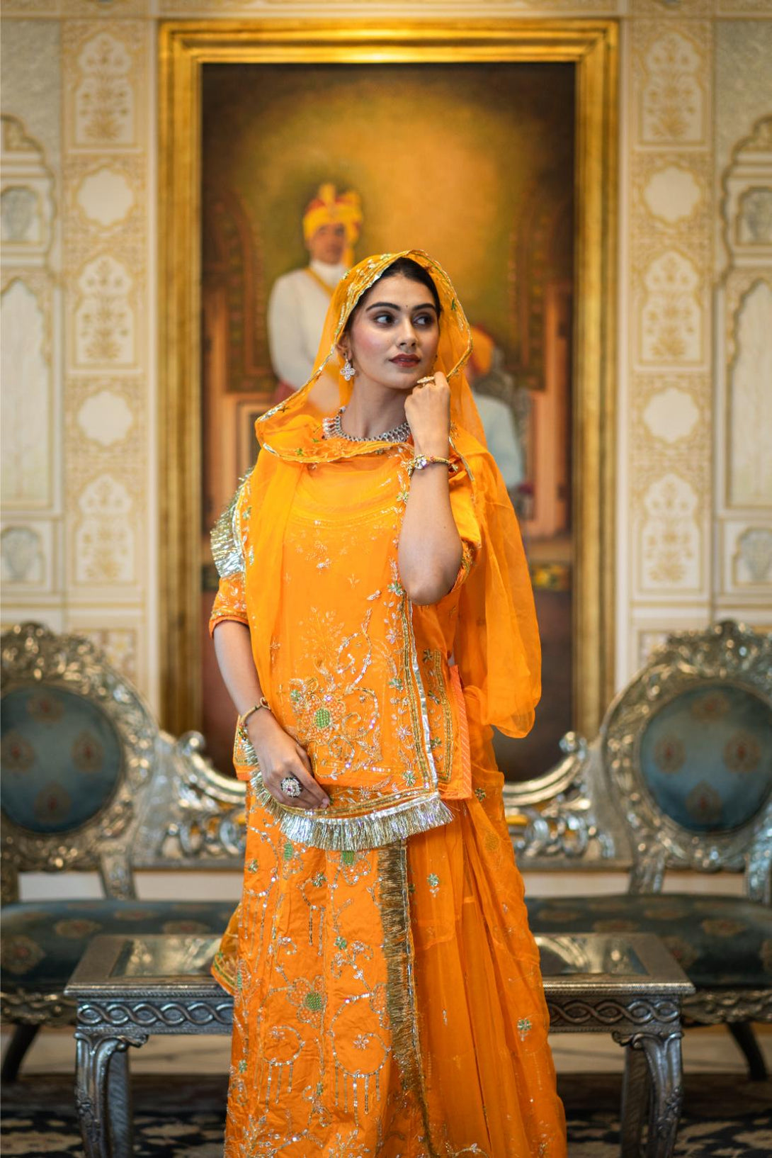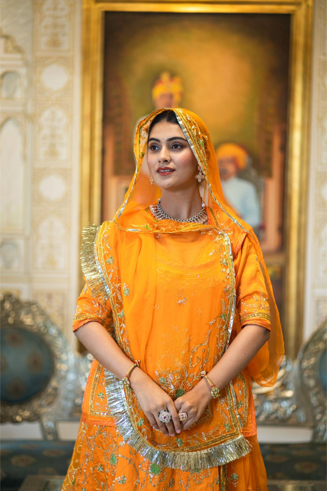 Radiate joy and elegance with this Yellow Poshak Bridal Wear. The vibrant yellow hue symbolizes celebration and new beginnings, while the intricate craftsmanship adds a regal touch. Perfect for brides seeking a bold yet traditional look, this poshak blends luxury with heritage, making it the ideal choice for your special day.