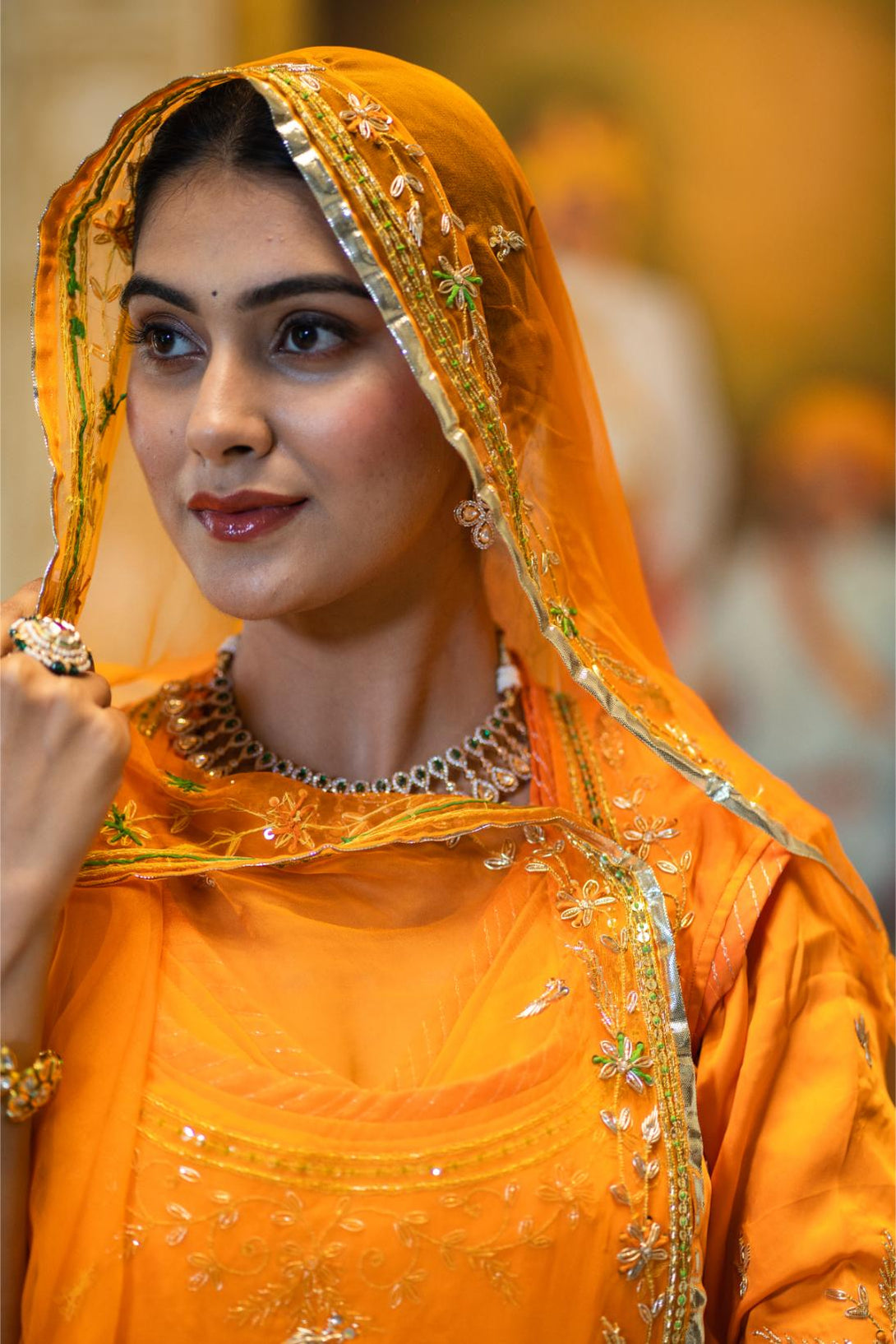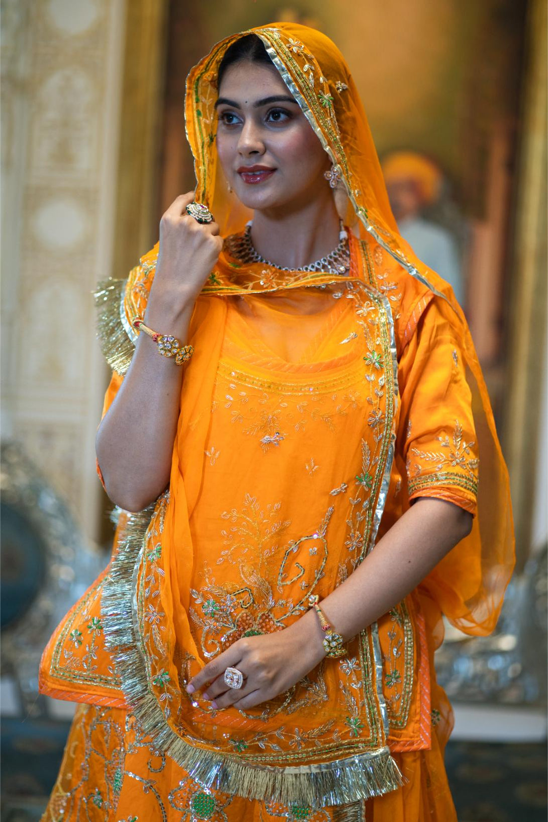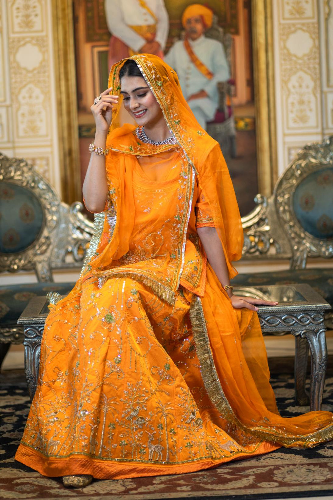 Radiate joy and elegance with this Yellow Poshak Bridal Wear. The vibrant yellow hue symbolizes celebration and new beginnings, while the intricate craftsmanship adds a regal touch. Perfect for brides seeking a bold yet traditional look, this poshak blends luxury with heritage, making it the ideal choice for your special day.